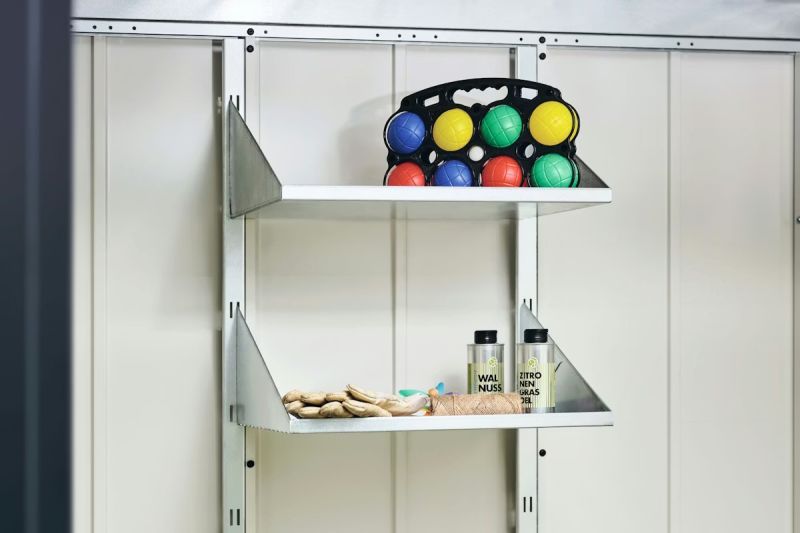 Široká nabídka příslušenství: Součástí standardní výbavy jsou dvě regálové lišty, jedna police regálu, držák na nástroje a dvě svodové okapové trubky; na přání dodáme další příslušenství jako regálové lišty, sklápěcí stoly nebo háčky na oblečení.